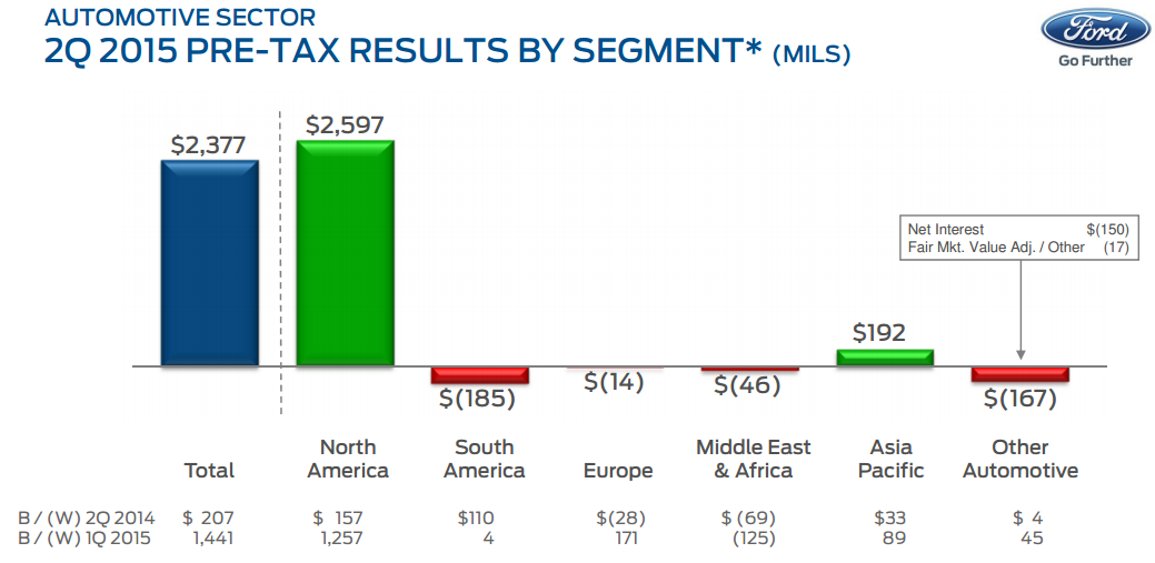 The driving force behind Ford's juicier bottom line in Asia-Pacific was lower costs and a favorable exchange rate. Despite China's economic slowdown, Ford believes its second-half results in its Asia-Pacific operations will actually improve from the first half of 2015, with more manufacturing capacity coming on line and new vehicles being launched. For the full year, Ford expects pre-tax results to check in higher than last year.