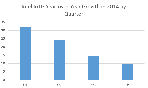 At Intel's 2014 investor meeting, company CFO Stacy Smith said that the Internet of Things business was expected to see an "uptick" in growth from the kind of growth rates seen in 2014. Given that the division grew by about 18% last year, it wouldn't have been unreasonable to expect at least 19% growth during 2015.