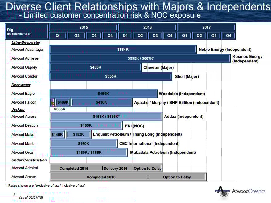 As that slide shows, nearly all of the company's fleet is under contract. The only concern for the balance of 2015 is that one of its jackups, the Atwood Mako, is running at the end of its contract. The company has yet to announce a new contract for that vessel, so it's assumed it will be idled once its current contract is complete, probably leading to additional revenue and earnings declines for the company for the balance of this year.