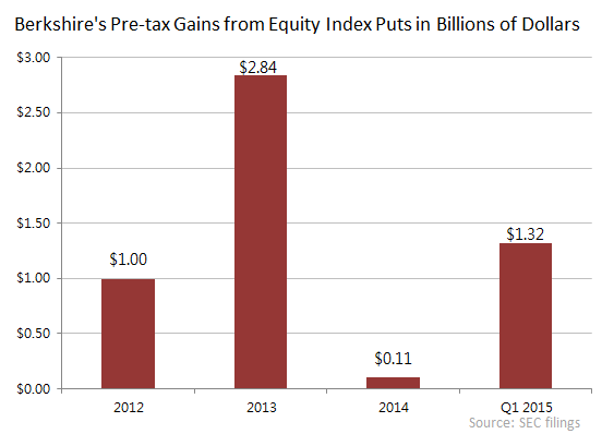 Unfortunately, the size of these positions can distort Berkshire's performance from quarter to quarter and year to year. The chart below shows the gains in its equity index puts over recent history, with Berkshire recognizing gains mostly due to rising global stock prices.