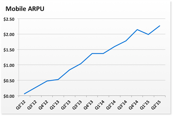Beyond looking at total mobile advertising revenue in dollar terms, Facebook has gotten extremely good at monetization. Mobile average revenue per user has skyrocketed and now sits at $2.27.