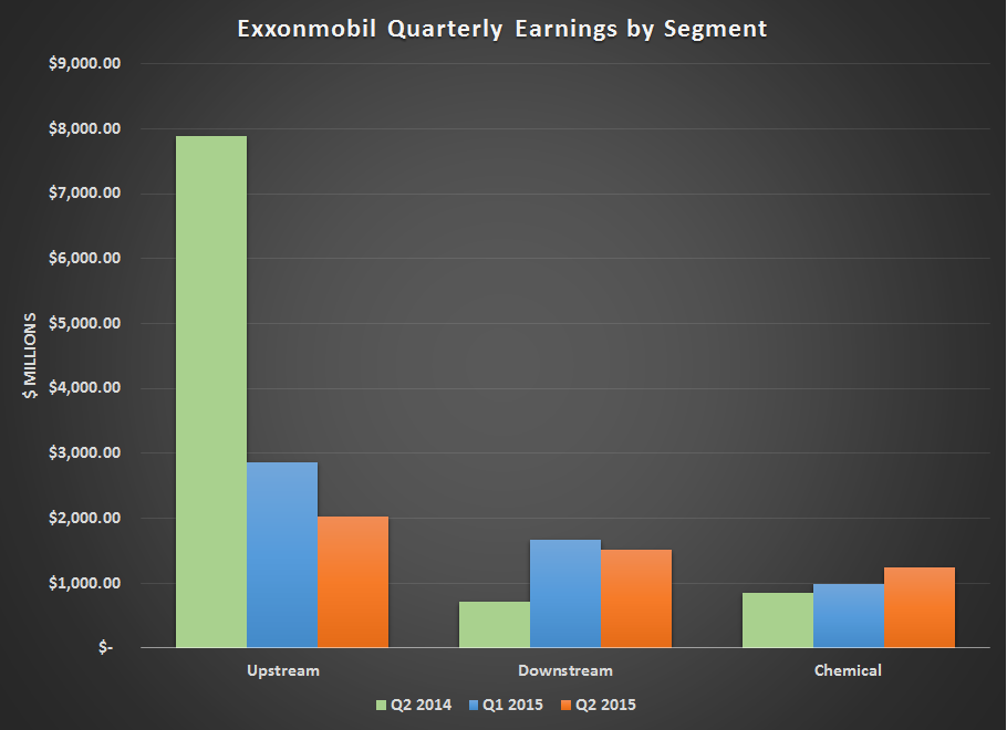 Over the past year or so as oil prices have been on the decline, Exxonmobil has actually been able to beat earnings estimates, but that streak came to an end this quarter as earnings per share of $1.00 missed analyst expectations by $0.06. As you might expect, oil prices absolutely killed the company's upstream operational profits, but some of those losses were made up for by strong results from its refining and chemical segments which both benefited from the cheaper crude feedstocks, as seen in this chart.