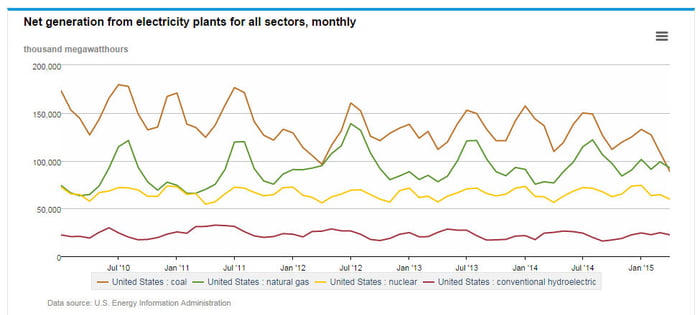 Indeed, low natural gas prices and a push to reduce greenhouse-gas emissions have left thermal coal on the outs. According to the U.S. Energy Information Administration, or EIA, natural gas surpassed coal in the U.S. power sector for the first time in April, when gas accounted for 31% (green line in chart) of domestic power production and coal 30% (brown line). Thus, too much coal and too little demand and ... low prices. This trend and the one in met are what's pushing miners to the brink.