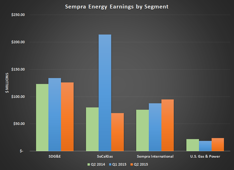 If Sempra were to report earnings under this segment using its old reporting methods, the SoCal Gas segment would have been $48 million higher than what is presently reported and a healthy increase over the same quarter last year. Once we get into 2016, it will be much easier to compare earnings on a year-over-year basis.