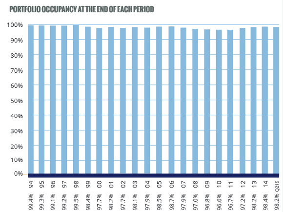 Of course, there is still some risk here. For example, one or more of Realty Income's major tenants could conceivably go bankrupt. However, because of the factors I've discussed here, Realty Income has maintained excellent occupancy throughout its history. Currently, the company's properties are 98.2% occupied, and that percentage has never dropped below 96%, no matter what the economy or real estate market is doing.