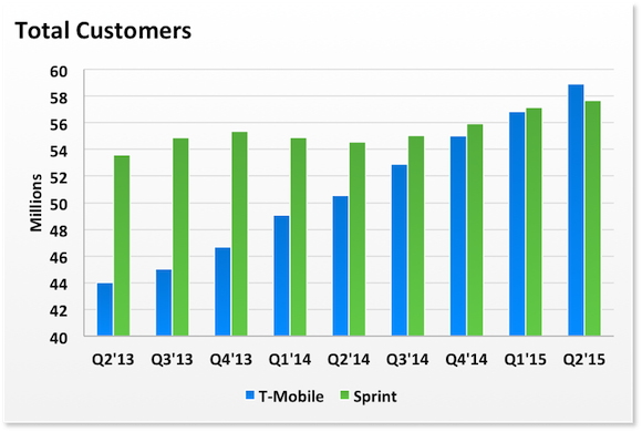 Over the past couple years, T-Mobile had been catching up to Sprint in terms of total subscribers -- fast. Some of that growth was acquired in the form of MetroPCS, which closed in 2013, but T-Mobile has done an admirable job of integrating MetroPCS (and its spectrum).