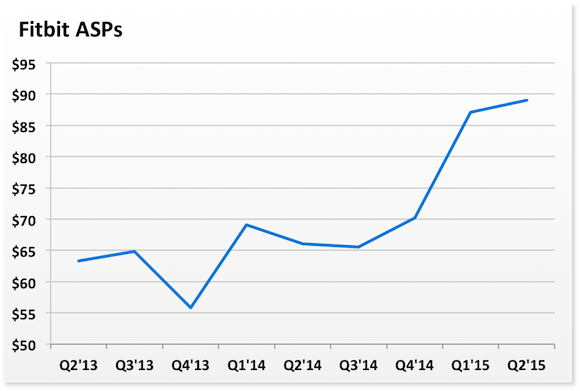 Fitbit has made consistent progress driving up the average selling price of its devices over the past couple of years, coming in at a record $88 last quarter.