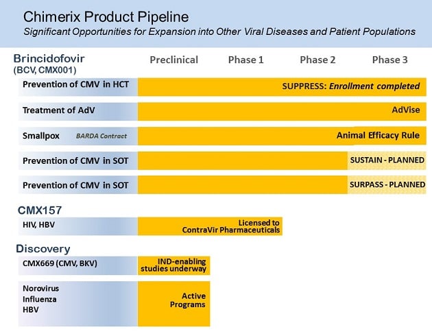 Beyond smallpox, Chimerix believes that brincidofovir could be a treatment option for a variety of diseases, especially those that relate to transplantation. The company is currently running a phase 3 clinical trial using brincidofovir as a treatment against cytomegalovirus, or CMV, which is a major complication that can arise after a hematopoietic cell transplantation, more commonly known as a bone marrow transplant.