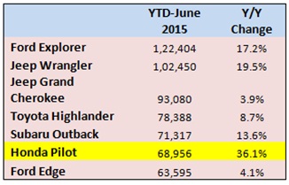 Honda (HMC +0.37%) is ruling the roost with the CR-V and the newly launched HR-V in the small crossover and compact crossover segments, respectively. Their sibling, the midsize SUV Pilot, isn't doing too badly, either. Pilot sales are up 36% from January through June, and with the launch of the redesigned 2016 Pilot last month, there's a strong case for the SUV to become one of the top sellers in the midsize SUV segment.