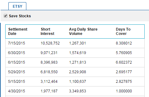 Undoubtedly, part of the demand originated from short sellers frantically purchasing back shares on the open market. Here's a screenshot of Nasdaq's charting of short interest in Etsy. As you can see, short interest peaked on July 15, just a day before the Google conference call. Shares short at that point represented almost 10% of Etsy's total share float: