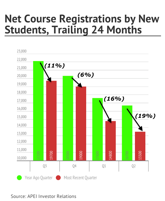 That's an important caveat, because it helps explain why APEI's stock is down more than 50% since early 2014. No metric is more indicative of where the school is headed than new student enrollments. Unfortunately, APEI doesn't break that number out, instead offering up net course registrations by new students. Here's how that figure has trended over the past two years.
