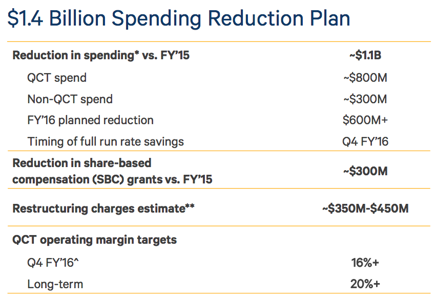 For the purposes of this analysis, let's drill down on the cost-structure improvements Qualcomm intends to make. Between a number of cost-cutting measures, Qualcomm estimates that it can lower its full-year operating cost base from roughly $7.3 billion in FY '15 to $6.2 billion by the end of FY '16. Here's an itemized version of the sources of the cost-cutting.
