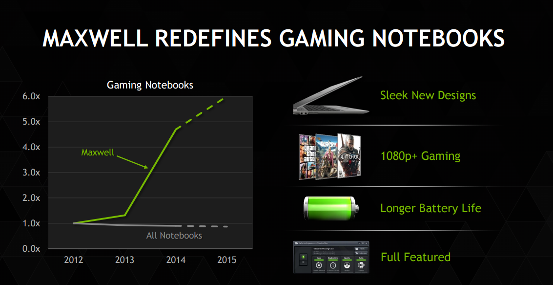 In its most recent quarter, graphics specialist NVIDIA (NVDA 1.45%) reported that revenue from its GeForce-branded graphics processors aimed at PC gamers grew by 51% year over year. Although a big chunk of NVIDIA's business comes from selling high-performance GPUs into gaming desktop PCs, the company has been quite bullish on the market for gaming notebooks.