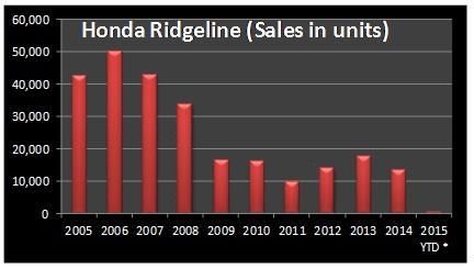 Ridgeline's best year since launch was 2006, but it's only been downhill since then -- from 2006 to 2014, sales have fallen a whopping 73%. Through June of this year, Honda sold only 534 Ridgeline units.