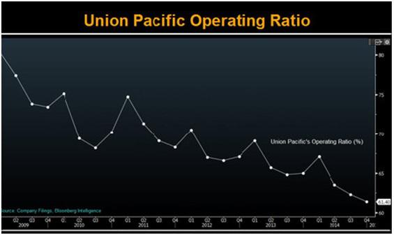 Union Pacific had registered an all-time-low quarterly operating ratio of 62.3% in the third quarter of 2014. Higher business volumes, the company's focus on improving service, and a 5% drop in diesel prices were the key factors behind the operational achievement.