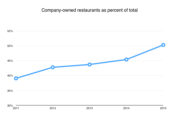 The level of corporate control has been inching higher for years, but this quarter's $160 million franchisee buyout finally tipped the scales and pushed franchisees into the minority.