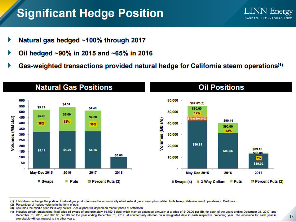 I'm going to use upstream MLP LINN Energy (LINE +0.00%) as an example, because it has one of the strongest and most diverse hedge books in the oil industry, as roughly 90% of its production is hedged for 2015. We can see this on the following slide:
