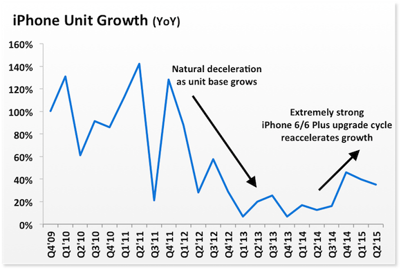 It's conceivable that this might even happen this year. The iPhone 6 and 6 Plus upgrade cycle has been utterly massive. The double-edged nature of that statement is that while Apple is selling more iPhones than ever before, it creates a tough comparison for the subsequent cycle. Consider this chart of unit growth over the past few years (I omitted the earliest years because the growth of over 500% in some quarters off extremely small bases skewed the chart).