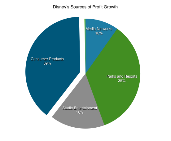 It's actually merchandise sales that are powering record results at Disney these days. Despite accounting for less than 10% of all revenue, the consumer products unit is kicking in 39% of profit growth so far this year: