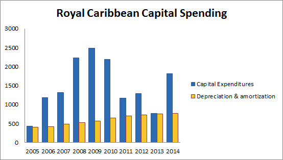 Because Royal Caribbean regularly adds new ships to its fleet, capital expenditures almost always exceed depreciation. Royal Caribbean's reported earnings during the past decade would have been negative had it expensed newbuild costs instead of capitalizing them. As a result, Royal Caribbean's free cash flow is materially lower than its reported earnings.