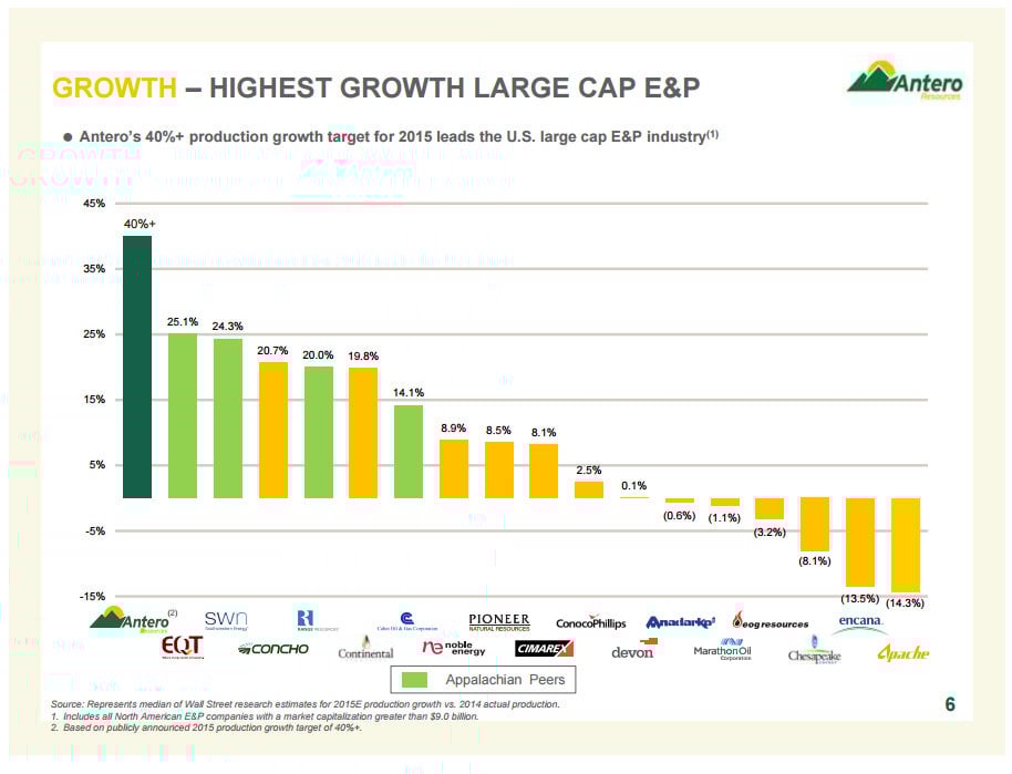 As that slide notes, Antero Resources is the fastest-growing large-cap energy stock as it is expected to deliver more than 40% production growth in 2015. Meanwhile, Southwestern Energy is expecting the third-fastest production growth at 24.3% and Range Resources is fifth best at 20%.
