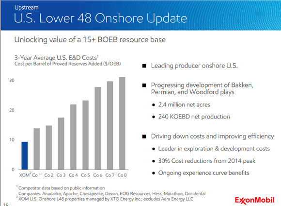 A major critique of ExxonMobil and its other large integrated peers was that they were unable to achieve the cost efficiencies some of the independent oil and gas producers were in U.S. shale drilling. It looks as though that's starting to become a myth, because this company has been able significantly lower its capital costs. Says Woodbury: