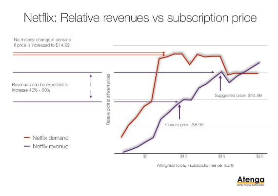 According to price optimization experts at Atenga, the ideal price for domestic Netflix services today is roughly $15 per month. Anything less means leaving money on the table. The picture probably doesn't change much in Western Europe, though we'll see where Netflix sets its launch prices for more price-sensitive markets like Portugal and Spain this fall.