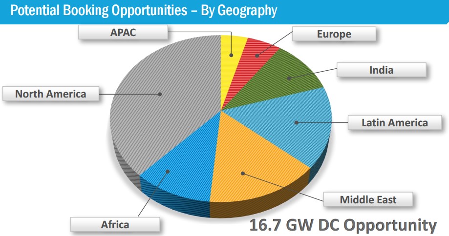 In fiscal 2014, First Solar's international operations accounted for 10% of its total sales, including a 141 MW solar plant in Chile and a 155 MW project in Australia. First Solar also beat SolarCity to Mexico with a 2013 acquisition of development assets, although those projects seem to be in the planning stage for the time being. But across the globe, First Solar, has identified 16,700 GW of booking opportunities, with a sizable chunk in Latin America.