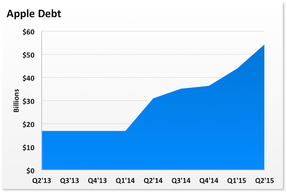 Over the past few years, the richest company in the world has continued borrowing increasing amounts of money from all over the world. Apple's (AAPL +1.78%) debt position has ballooned considerably ever since it launched its capital return program in 2012. Including commercial paper and long-term debt (current and noncurrent), Apple had an incredible $54 billion in debt at the end of the second quarter, a figure that's been steadily rising over the years.