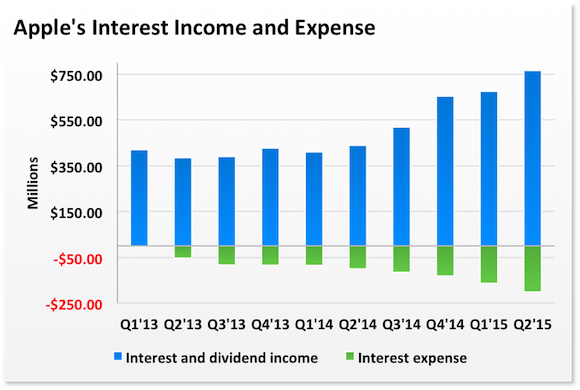 On Apple's income statement, you'll notice the line item "Other income and expense." It's here that Apple reports things like interest and dividend income, interest expense, and the results from its various hedging operations. Starting last year, Apple began breaking down this line item to provide investors with more detail, and the great thing here is that interest and dividend income from Apple's sizable investment portfolio more than offset its interest expense by a healthy margin. This is how Apple delivers all of the benefits of its debt-funded capital return program at no net cost.