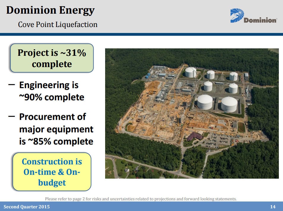 Farrell also updated investors on the progress of its Cove Point LNG facility saying that it is "approximately 31% complete and is on-time and on-budget." Further details on the project can be found on the slide below.