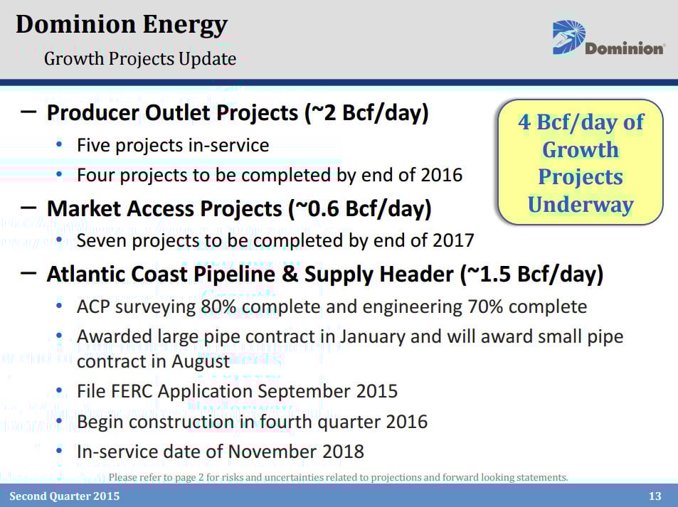 He then turned his attention to its Dominion Energy subsidiary saying that, "Progress on our growth plan ... for the 4 billion cubic feet per day of projects is under way." These projects are detailed on the following slide: