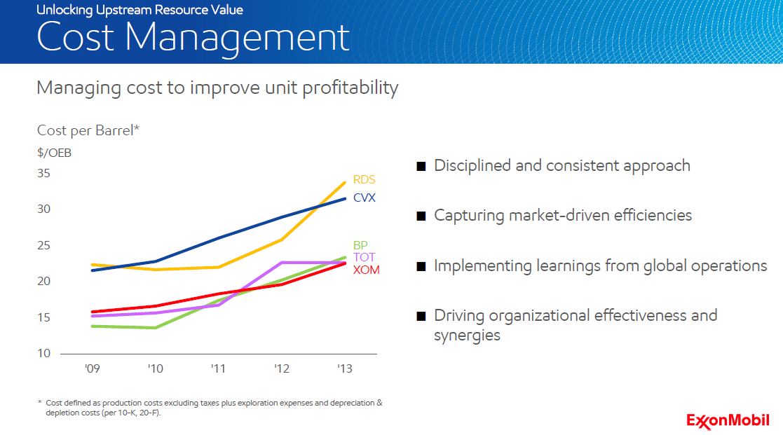 Even a peer-to-peer comparison reveals that ExxonMobil has performed rather smartly in managing costs, as the following chart depicts.