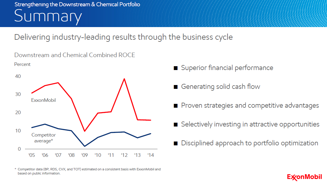 If ExxonMobil was a stand-alone refiner, it would be the biggest North American refiner. That has immense benefits for the company. Given record crude oil production in the United States and the resulting plunge in prices, Exxon's exposure to cheap feedstock is phenomenal. Averaged over a complete business cycle, the company's returns are much higher than average refining margins for integrated oil companies, thus helping it to generate significant free cash flow.