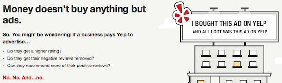 Yelp has tried very hard to regain some of that lost trust, assuring visitors that companies "can't pay to alter or remove their reviews." This notice is posted on the top of every review page now, which takes you here: