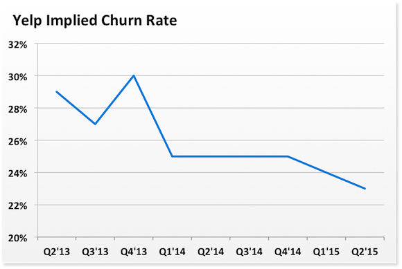 To be fair, Yelp has been improving this figure in recent quarters, but at the same time a churn rate of over 20% isn't what I would consider healthy. That's an awful lot of local advertising customers that don't see value in Yelp's ads, while small local businesses don't have lavish marketing budgets.