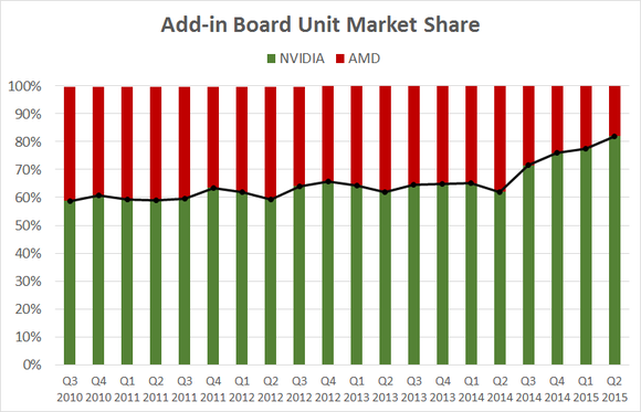 Since then, AMD has been bleeding market share. In September of last year, NVIDIA launched some disruptive products, the GTX 970 and GTX 980, beginning a trend of market share losses for AMD that has yet to let up. During the first quarter of 2015, AMD's share of the discrete graphics card market had declined to just 22.5%, according to Jon Peddie Research.