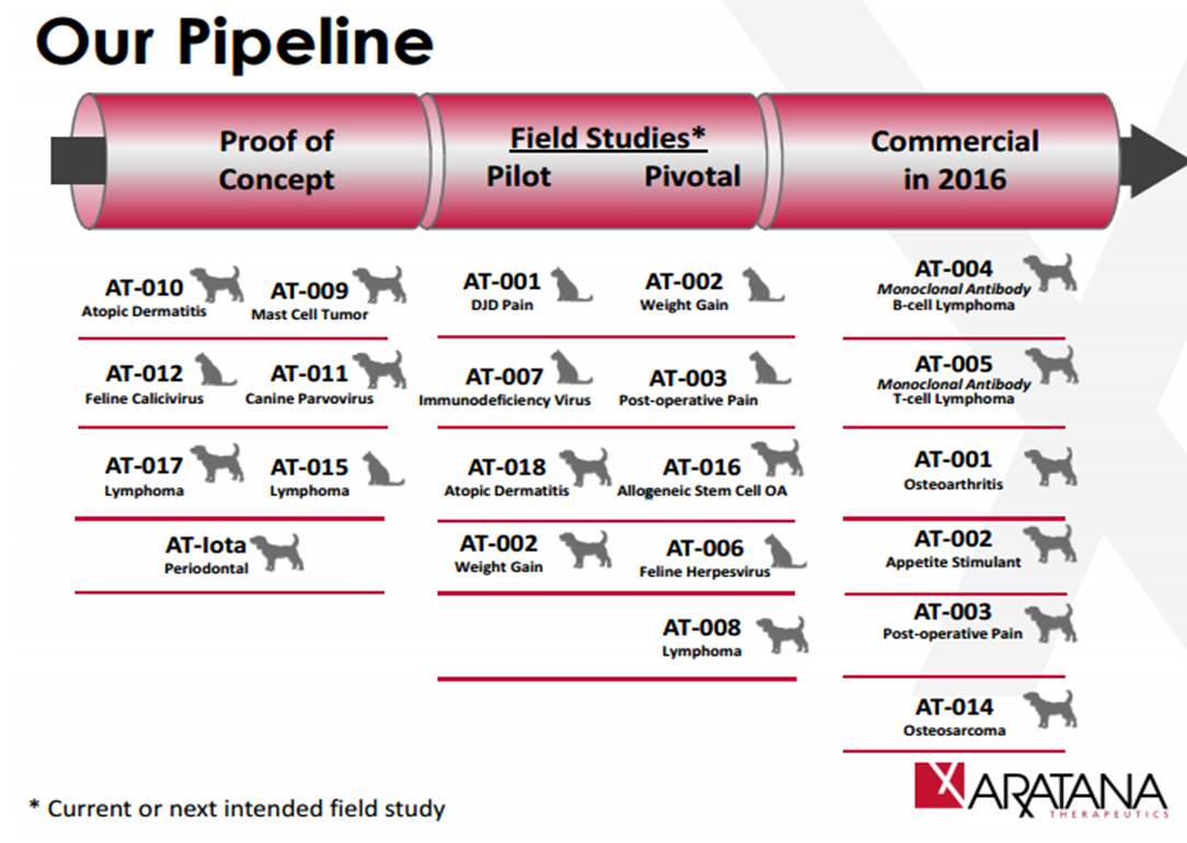 For a number of reasons, Aratana looks to me like a great pickup during these turbulent times. First off, the company is rapidly transitioning from an experimental-stage entity into a potentially robust commercial operation. This summer, Aratana reported successful late-stage trial results for both its appetite stimulant, capromorelin (AT-002), and its extended-release bupivacaine liposome injectable suspension, AT-003, licensed from Pacira Pharmaceuticals and indicated for post-surgical pain in dogs. As a result, this tiny pet healthcare company is on track to bring a whopping six new products to market next year:
