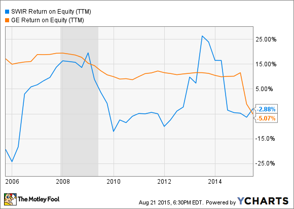 It's not just management's acquisition track record that's underwhelming. As noted in two recent articles, the company has delivered relatively disappointing financial performance for the past five years, even though it claims leadership in the machine-to-machine, or M2M, communications market. Management is arguably subtracting value, given how often its return on equity has been negative in the past 10 years. ROE is widely considered a measurement of how effectively management uses stockholder capital. Note that ROE has been negative on an annual basis since 2009. To be fair, General Electric, another company looking to the IoT for growth, has also seen it's ROE dip recently. That said, GE's reputation as a well-managed company is supported by a much steadier and higher ROE prior to 2015.