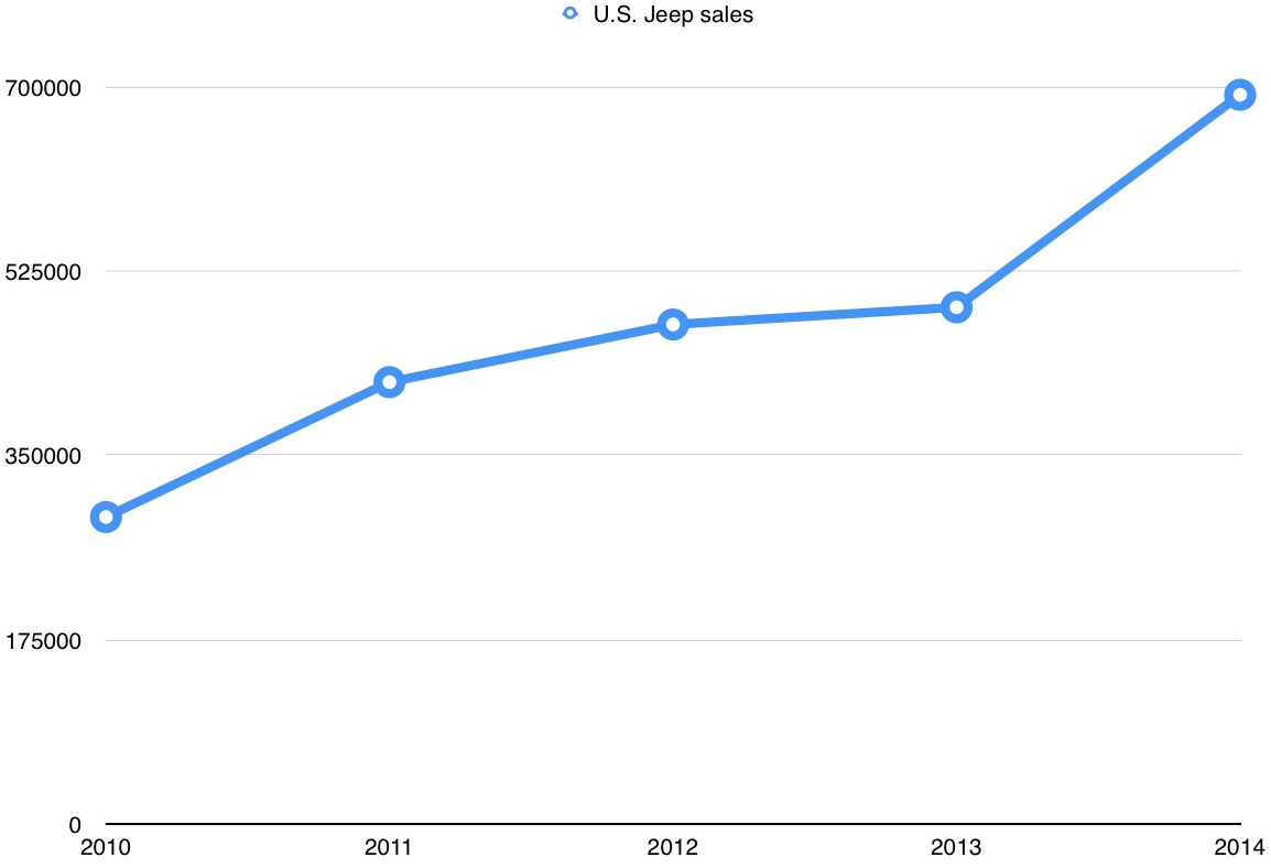 Fiat Chrysler (FCAU +0.00%) has a lot of problems, but Jeep isn't one of them: The rugged SUV brand's sales have absolutely boomed during the last five years. The chart doesn't include 2015, but through July, Jeep sales are up another 21% over last year's stratospheric levels.
