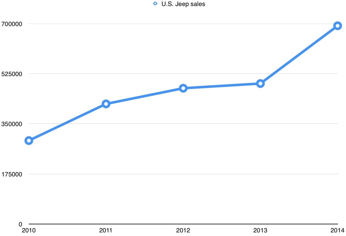Total U.S. sales for the Jeep brand, 2010-2014. Source: Fiat Chrysler Automobiles.