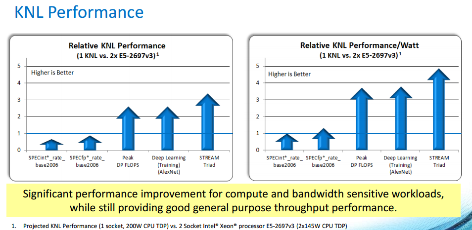 In its Hot Chips presentation, Intel provided a slide showing both performance and performance-per-watt figures of Knights Landing relative to two 14-core Haswell-based Xeon E5-2697 v3 chips: