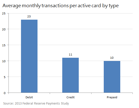 Prepaid card users generally spend less than credit card users in dollar terms, but believe it or not, they create almost as many transactions per card, per month.
