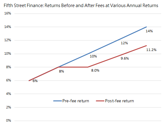 Last quarter, Fifth Street Finance earned a pre-fee return on equity of about 2.3% for the quarter. Thus, the result was that shareholders only received two percentage points of that return, with the remainder flowing to the asset manager. That's how the fee structure works.