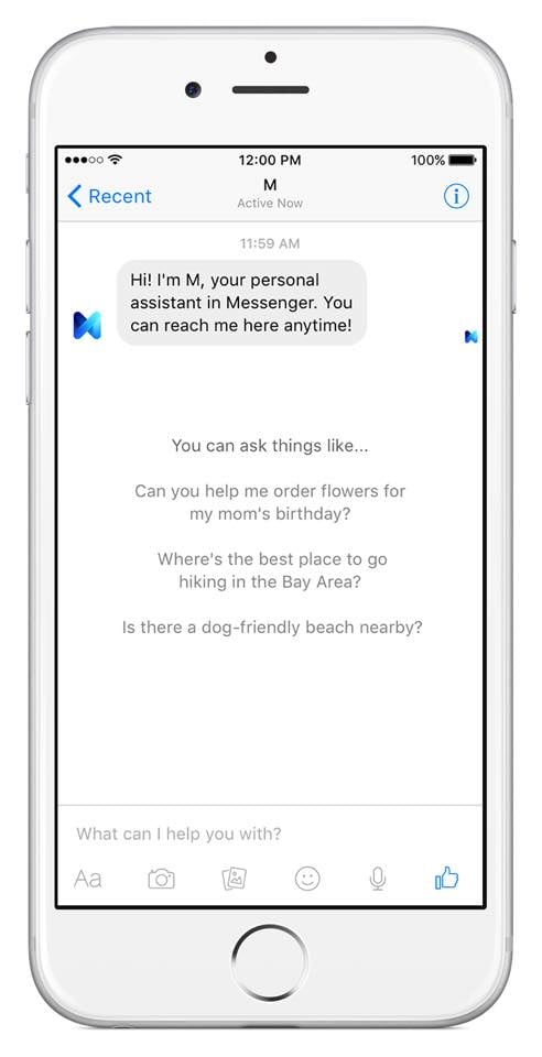 Haven't seen M yet? You're not alone. Facebook has only launched the personalized assistant for a couple hundred people in the Bay Area, according to Re/Code. But the company plans to eventually launch M for everyone using Messenger.