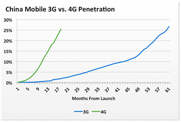 It's funny how investors talked about Apple's deal with China Mobile for years before it materialized, and once the partnership was officially inked, no one seemed to pay much attention to it. There's not a lot of data about the mix of iPhones among carriers, but looking at high-level user data is still pertinent. What's incredible is just how fast LTE has been adopted by China.