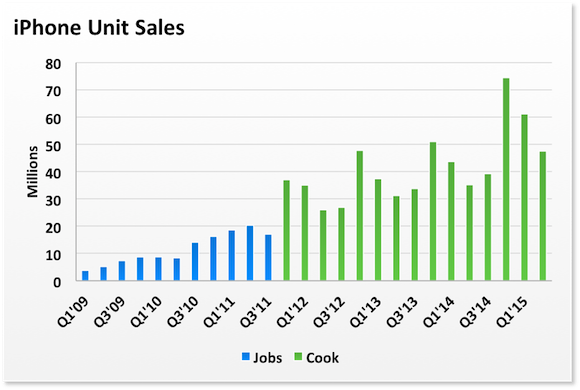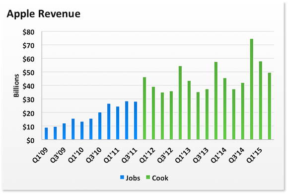 With Apple shipping nearly 75 million iPhones a couple of quarters ago, it's odd to think that Apple had at most shipped 20.4 million iPhones under Jobs. Expectedly, revenue growth over the same period follows a similar trajectory.