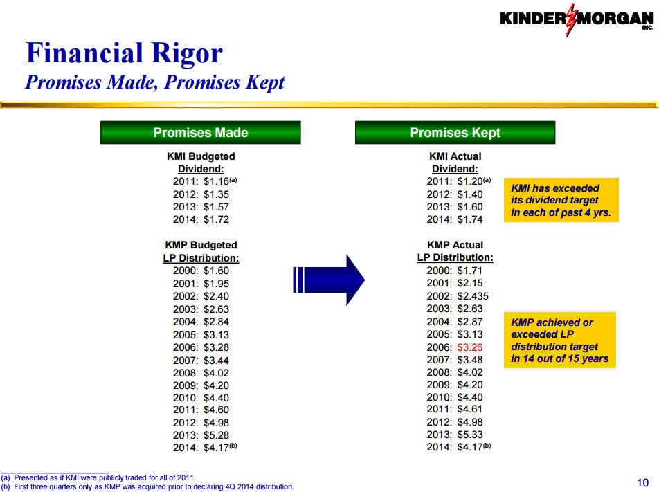 He's not just saying this because it's what investors want to hear; he's saying it because Kinder Morgan is a company that keeps its promises to shareholders. In fact, the company has a history of not just keeping its promises, but exceeding goals. As the following slide shows, it has exceeded dividend targets nearly every year, only missing its target once.