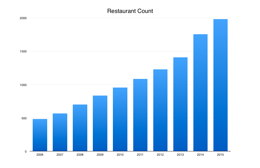 Number of restaurants at the end of each fiscal year. 2015 is projected. Source: Chipotle filings.