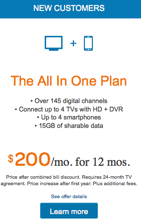 In this scenario the company advertises a low price for the first 12 months. The catch is that the deal is for 24 months and the price skyrockets in the second year. For example, the company's "All In One" plan comes with over 145 digital channels, up to four TVs with DVR, up to four smartphones, and 15GB of shareable data for $200 a month.